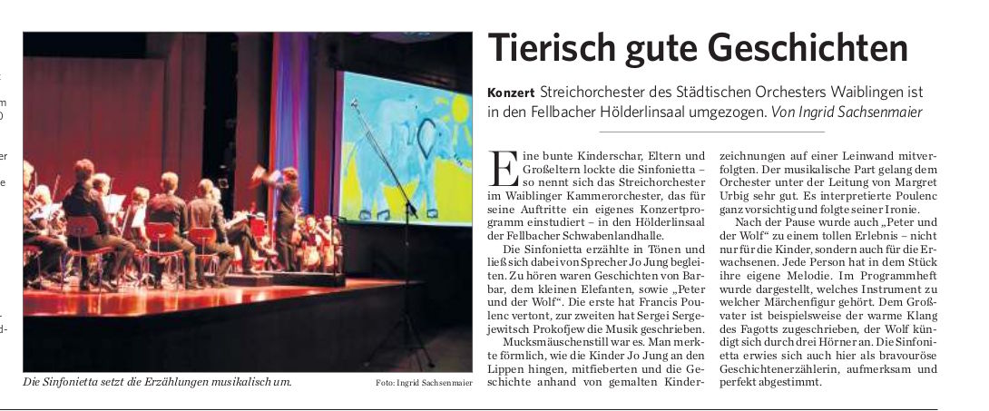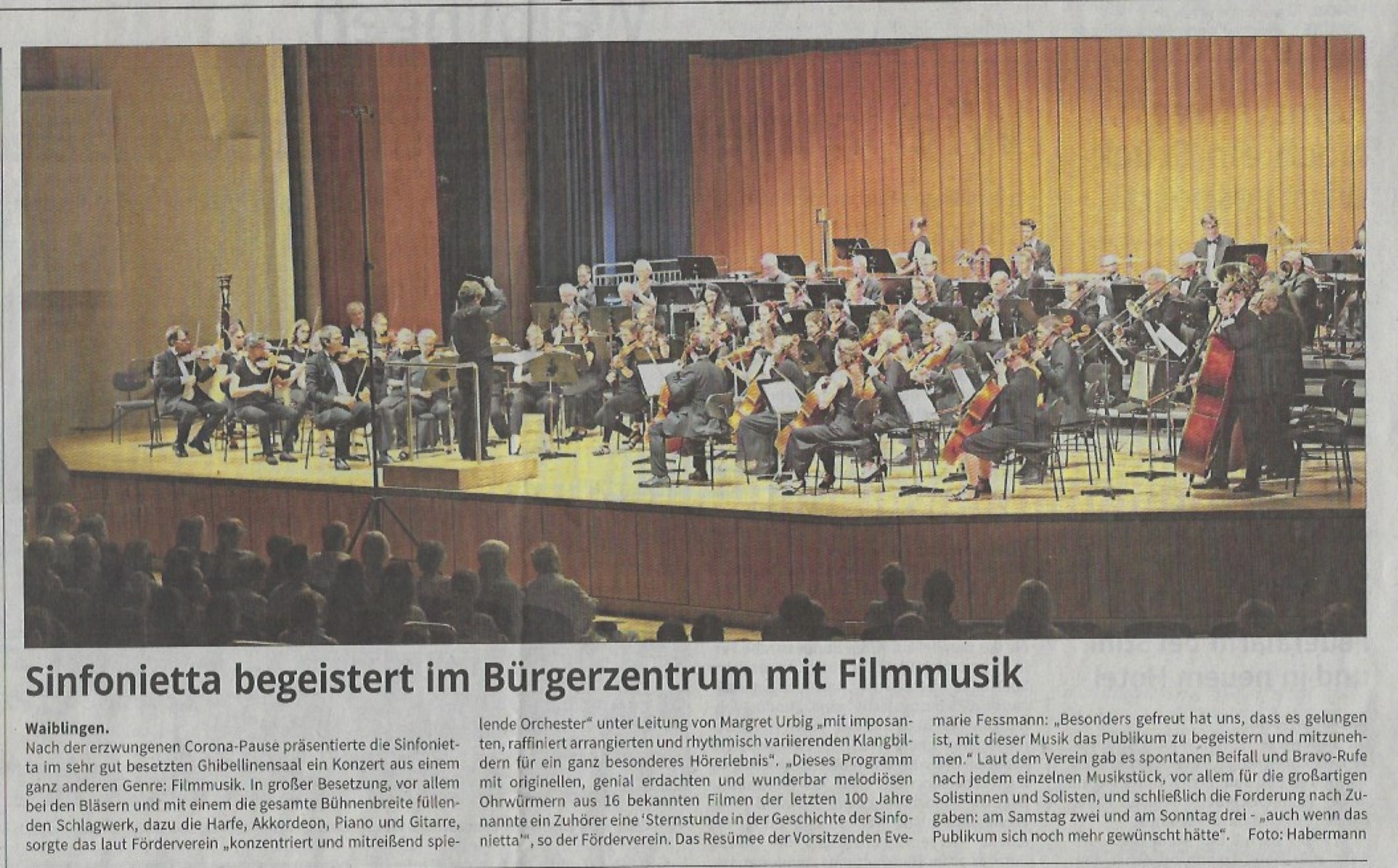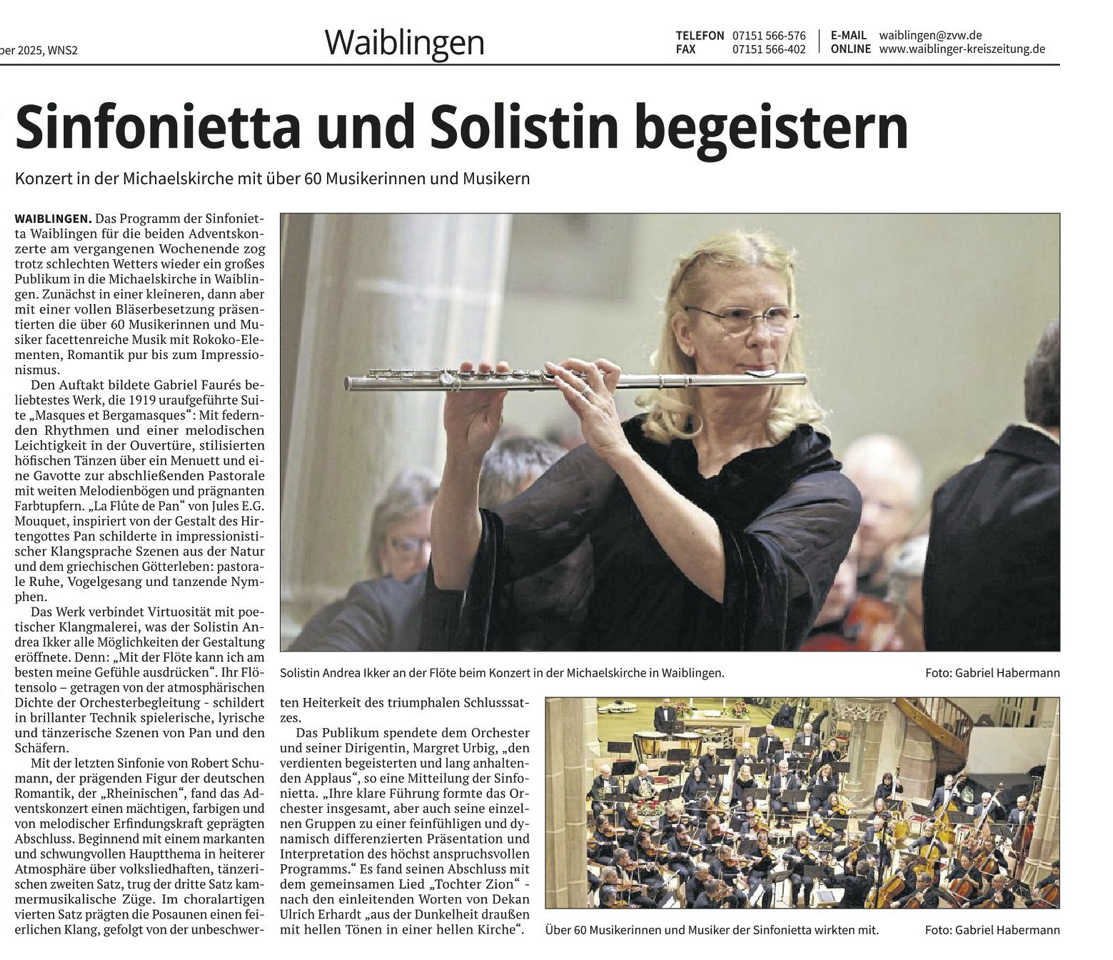 Das diesjährige Adventskonzert der Sinfonietta war wirklich etwas Besonderes: drei zum Teil noch nicht so bekannte Werke von Komponistinnen, eine großartig aufspielende Sinfonietta und ein wunderbarer Solist ließen in der an beiden Abenden sehr gut besuchten Michaelskirche eine musikalisch und emotional spannungsgeladene Stimmung aufkommen. Sie hielt bei vielen Besuchern noch lange nach den letzten Takten des Konzertes an. Hier der Bericht der Waiblinger Kreiszeitung: