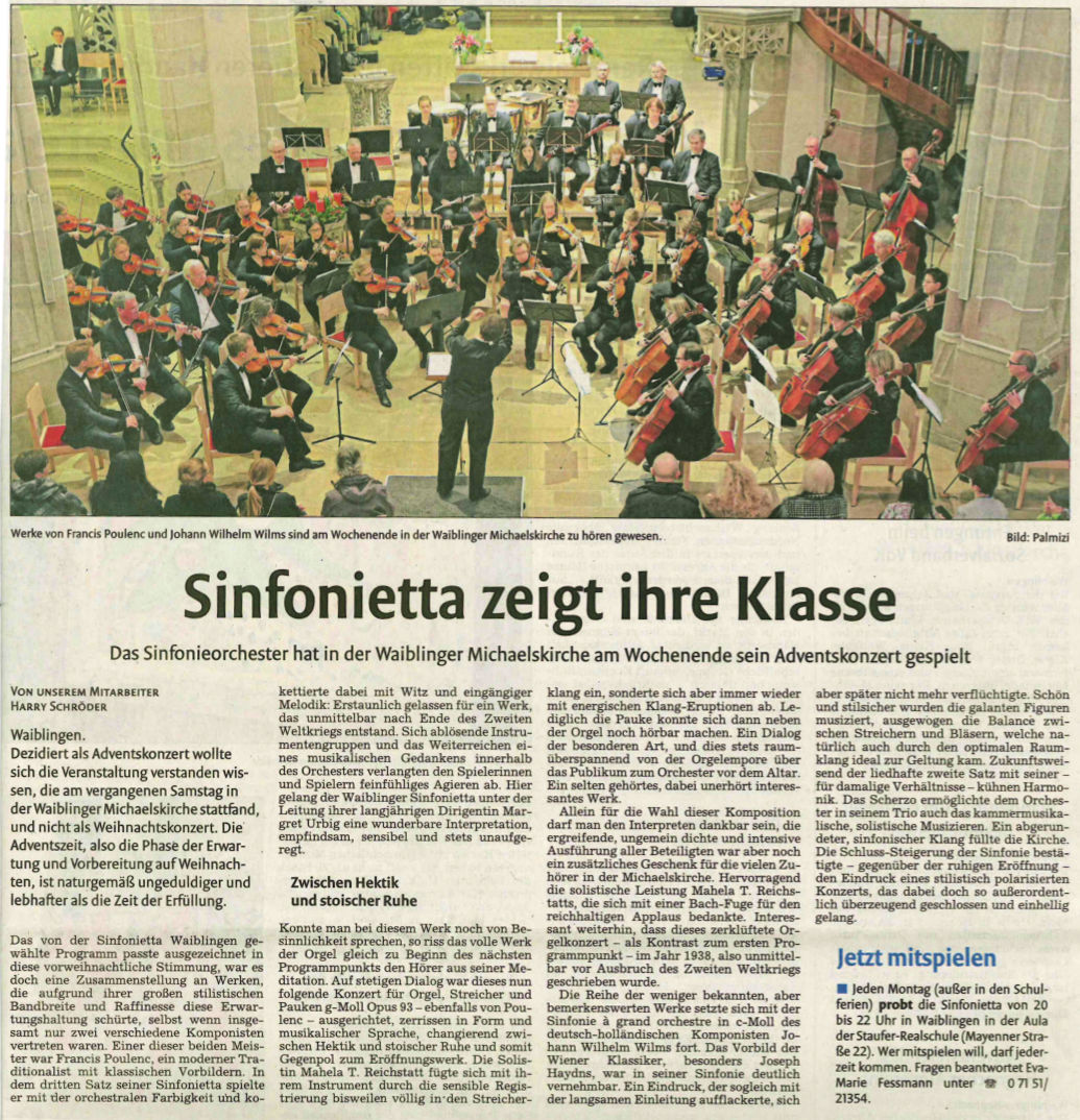 Am 6. und 7. Dezember gab die Sinfonietta ihr diesjähriges Adventskonzert in der Michaelskirche. Hier der Bericht der WKZ vom 10. Dezember: