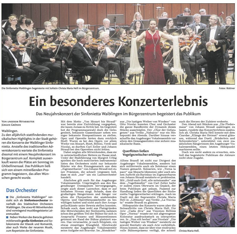Wie schon vor drei Jahren, war auch das „Neujahrskonzert“ der Sinfonietta am 10. Februar ein riesiger Erfolg. Schon Tage vor dem Konzert war der Ghibellinensaal im Bürgerzentrum Waiblingen mit seinen mehr als 800 Plätzen ausverkauft. Am Abend selbst erlebten die Besucher ein vielseitiges Programm mit Arien, Duetten, Chören und Orchesterstücken aus bekannten Opern und Operetten, dargeboten von einem spielfreudigen Orchester, einem professionellen Gastchor aus Augsburg und zwei blendend aufeinander im doppelten Sinne „eingespielten“ Sängern, der Solistin Christa Maria Hell aus München Haar und Alfons Brandl aus Augsburg.