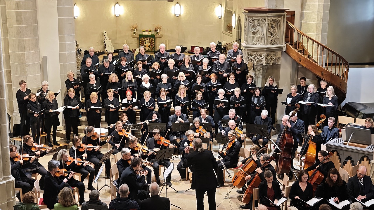 Chor, Orchester und Solisten, die sich ja vorher noch nicht getroffen hatten, mussten sich in zwei intensiven Proben auf den gemeinsamen Auftritt vorbereiten, was sehr schnell gelang, so dass sie gut eingespielt und eingesungen die beiden Konzerte am Freitag und Samstag angehen konnten. Die Marktkirche war am ersten Abend gut und am zweiten Abend fast bis auf den letzten Platz gefüllt. Anhaltender Beifall der Konzertbesucher bestätigte das hohe Niveau der dargebotenen Musik. So konnten nach der zweiten Aufführung die Chor- und Orchestermitglieder noch einige Stunden im Gemeindehaus der Pfarrei das gemeinschaftliche Erlebnis feiern, die Köstlichkeiten des von den Chormitgliedern bereiteten Buffets genießen, sich unterhalten und Erfahrungen austauschen.