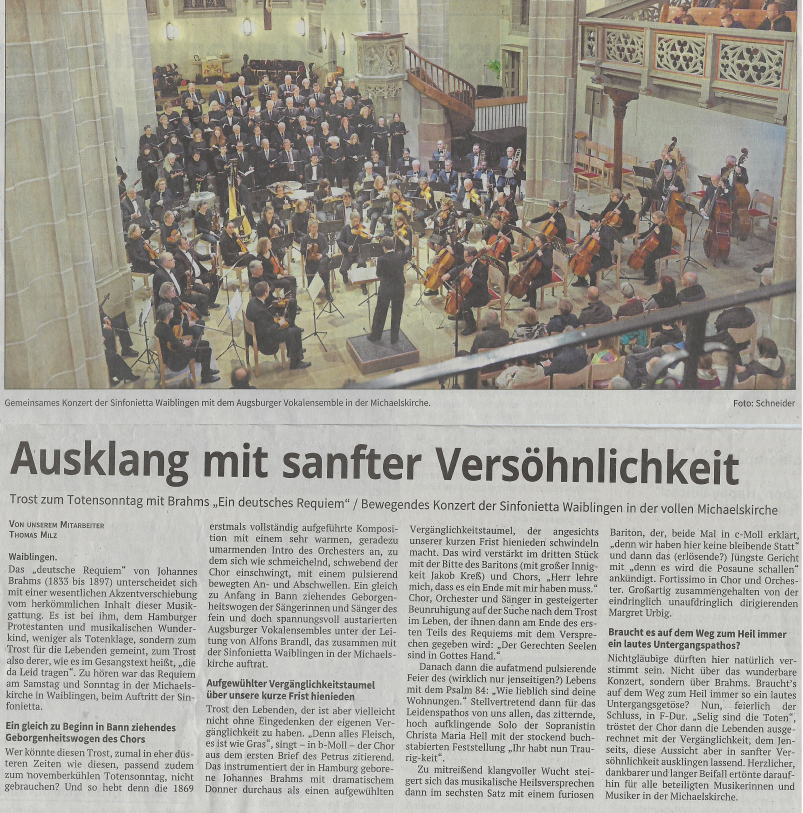 Gleich am Montag nach dem Konzert begann die Sinfonietta mit den intensiven Proben für das nächste Konzert: am 19. und 20. November steht das Deutsche Requiem für Soli, Chor und Orchester von Johannes Brahms mit dem Augsburger Vokalensemble auf dem Programm.